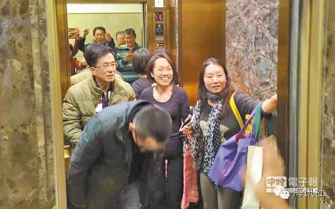 闔家團圓陳水扁(左一)返回高雄人文首璽住處,媳婦黃睿靚(右二)親至停車場迎接,搭電梯上樓前,兒子陳致中(前左)向現場親友鞠躬致意。(摘自汪笨湖臉書)