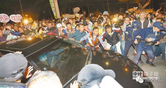 】扁迷歡呼前台湾领导人陳水扁乘坐車輛抵達高雄住處人文首璽前被支持者包圍,現場亂成一團,好不容易進入住處停車場。(謝明祚攝)