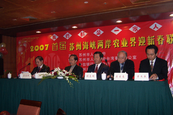 2007年1月31日,2007首届苏州海峡两岸农业界迎新春联谊会在苏州某酒店举行。来自苏州各市区农业分管领导、台资农业企业、市农业龙头企业负责人及农口部门负责人等200余人参加了联谊会。