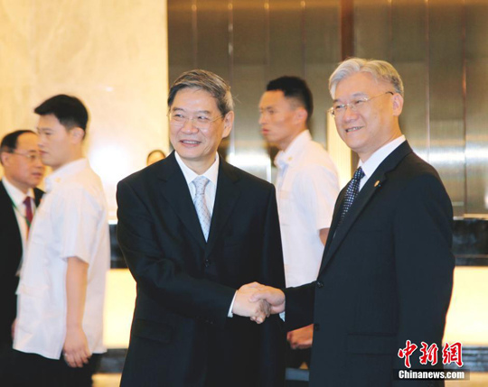 资料图:5月23日,国务院台办主任张志军(左)在金门,与台湾方面陆委会主委夏立言(右)举行会面。图为张志军抵达会场时,与夏立言握手致意并交谈。黄少华 摄