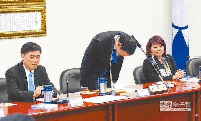 国民党18日举行临时中常会,前主席朱立伦(中)向中常委报告,败军之将必须负起最大责任,并深深鞠躬致歉,由黄敏惠(右)暂代主席。(图/台湾《中国时报》 陈信翰摄)