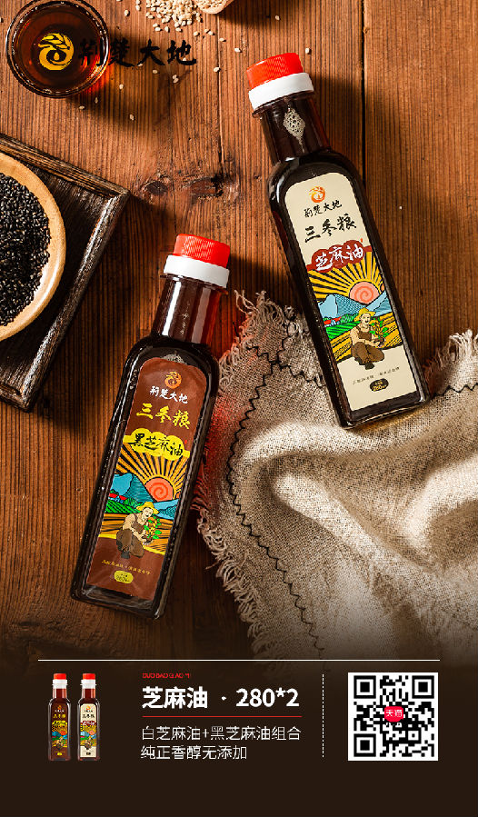 荆楚大地三冬粮芝麻油:从原料上把控芝麻油的出品质量,用心甄选颗粒饱满的芝麻,600多克左右的芝麻才能压榨出一瓶280ml的芝麻油,经过选料、焙炒、扬烟等工艺,保证芝麻油香味持久。油品经营纯正,色如琥珀,质地浓滑,其味无穷,凉拌、蒸菜、煲汤、蘸酱均可使用,是美食的好伴侣。