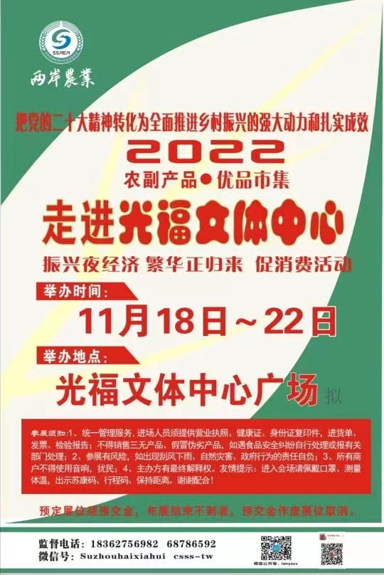 以实际行动贯彻落实党的二十大精神,积极服务乡村振兴,特别是乡村产业振兴和农产品流通需求。认真做好习近平总书记关于一手抓疫情防控,一手抓经济社会发展的重要指示精神。助推乡村振兴战略实施,实现农业农村现代化,促进乡村产业融合发展。在苏州市各级党委政府的大力支持下,由苏州市海峡两岸农业交流协会(中心)、台湾办事处、两岸农业杂志社举办的“农产品展销暨优品市集活动”于11月18日--22日在光福镇文体中心广场举行,活动期间将做好防疫工作,严格把好农产品质量安全关、用电安全和社区居民秩序安全,确保活动各项工作顺利展开和老百姓满意。
